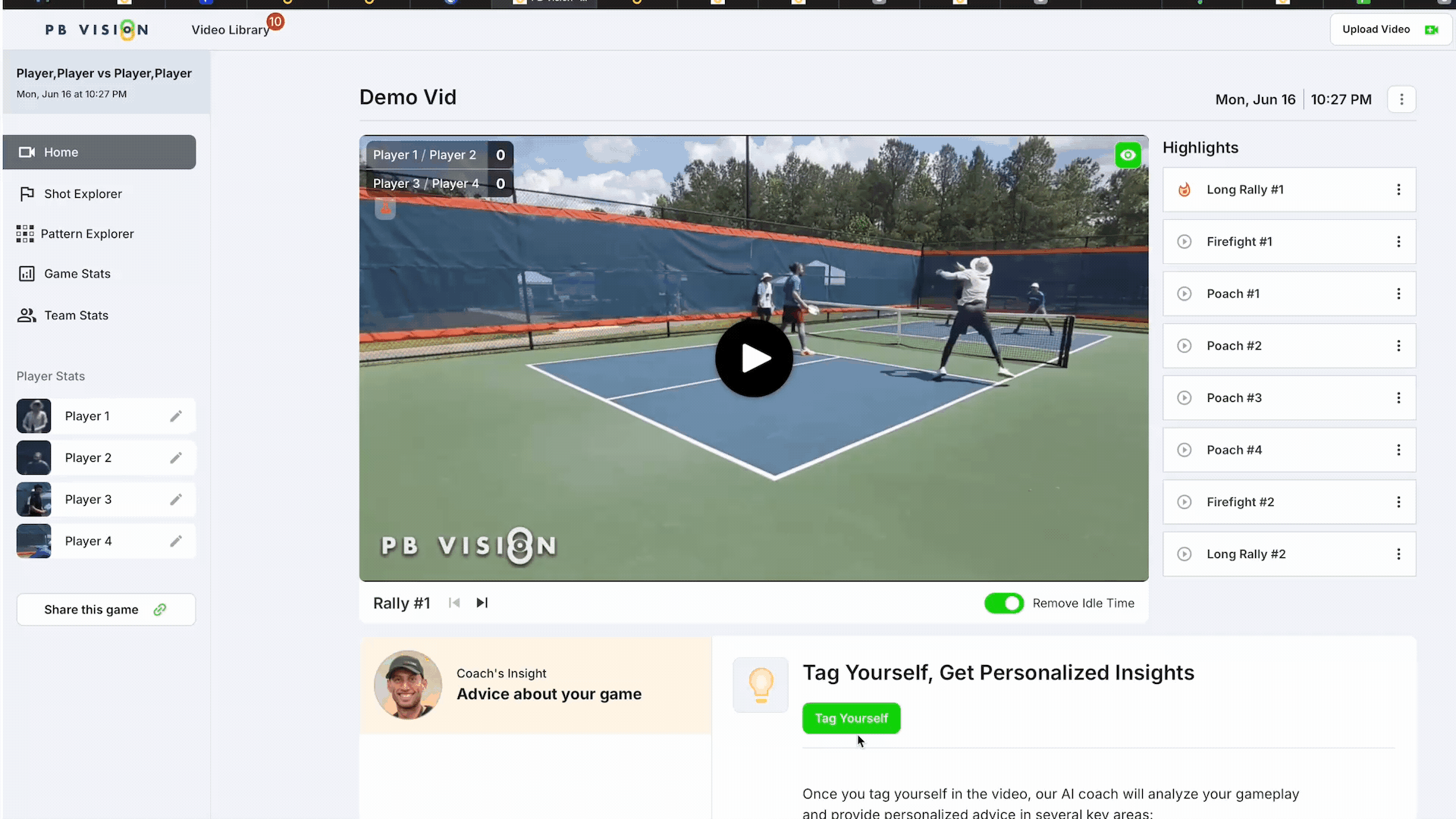 • Dead time removal, skill ratings, historical trends, shot/pattern explorer, player tagging